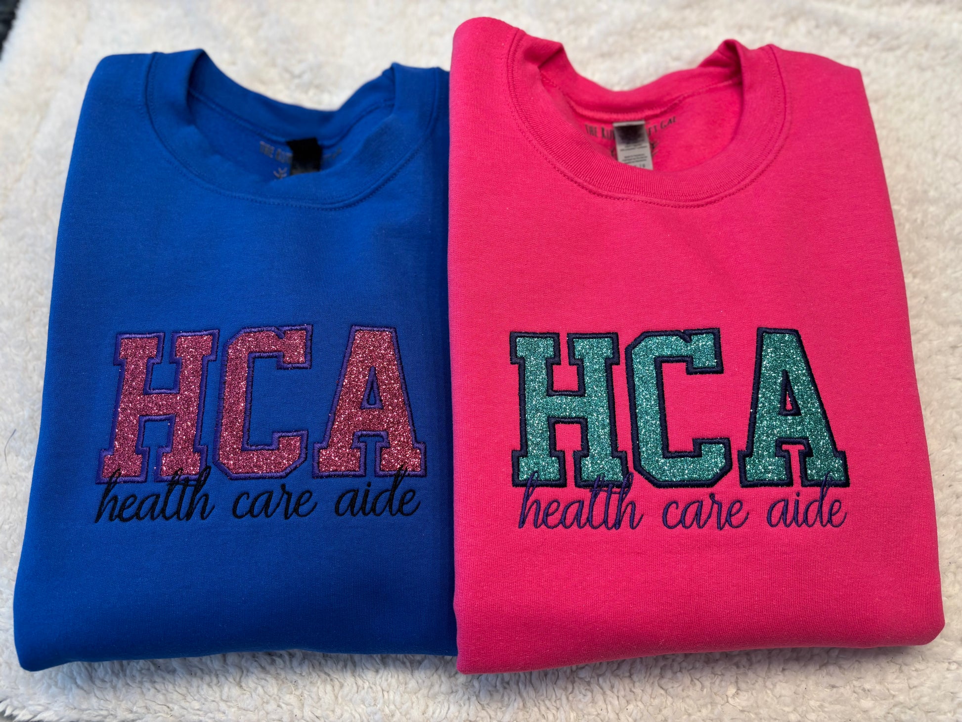 Embroidered crewneck, appliqué with glitter htv